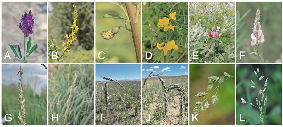 A. 紫花苜蓿(Medicago sativa);B. 黄花草木樨(Melilotus officinalis);C. 普通田菁(Sesbania cannabina);D. 百脉根(Lotus corniculatus);E. 箭筈豌豆(Vicia sativa);F. 红豆草(Onobrychis viciifolia);G. 羊草(Leymus chinensis);H. 多年生黑麦草(Lolium perenne);I. 披碱草(Elymus dahuricus);J. 老芒麦(Elymus sibiricus);K. 鸭茅(Dactylis glomerata);L. 一年生早熟禾(Poa annua)