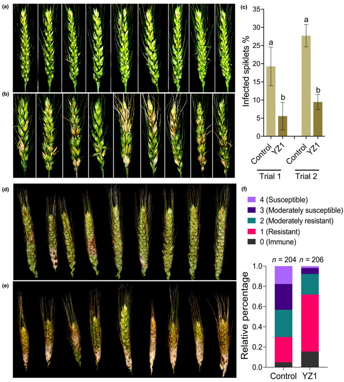 镰刀菌病害是全球小麦生产的一个重大威胁。典型菌株Fg可以侵染各个阶段生长的小麦,其导致的赤霉病是小麦四大病害之首。目前小麦赤霉病抗性种质缺乏,由于多年的农药使用,病害的抗药性也愈发严重。开发适宜的生防策略是当务之急。李小方研究员团队最近发现一株小麦内生菌YZ1,该菌在小麦促生和抗赤霉病方面展现巨大潜力。相关结果以“A potent endophytic fungus Purpureocillium lilacinum YZ1 protects against Fusarium infection in field-grown wheat”为题,发表在植物学知名杂志New Phytologist。