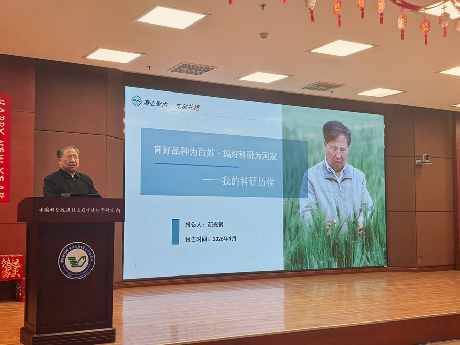 2026年1月23日上午,中国科学院遗传与发育生物学研究所精神大讲坛专题报告会在研究所1号楼215学术报告厅举行。河南省小麦生物学与规模化高效生产重点实验室主任茹振钢教授应邀作题为《育好品种为百姓·搞好科研为国家-我的科研历程》的专题报告。党委委员曹晓风院士、副所长鲁非研究员、育种前沿技术实验室第四党支部书记贺飞研究员以及研究所师生与职工代表参会。报告会由副所长(主持工作)傅向东院士主持。