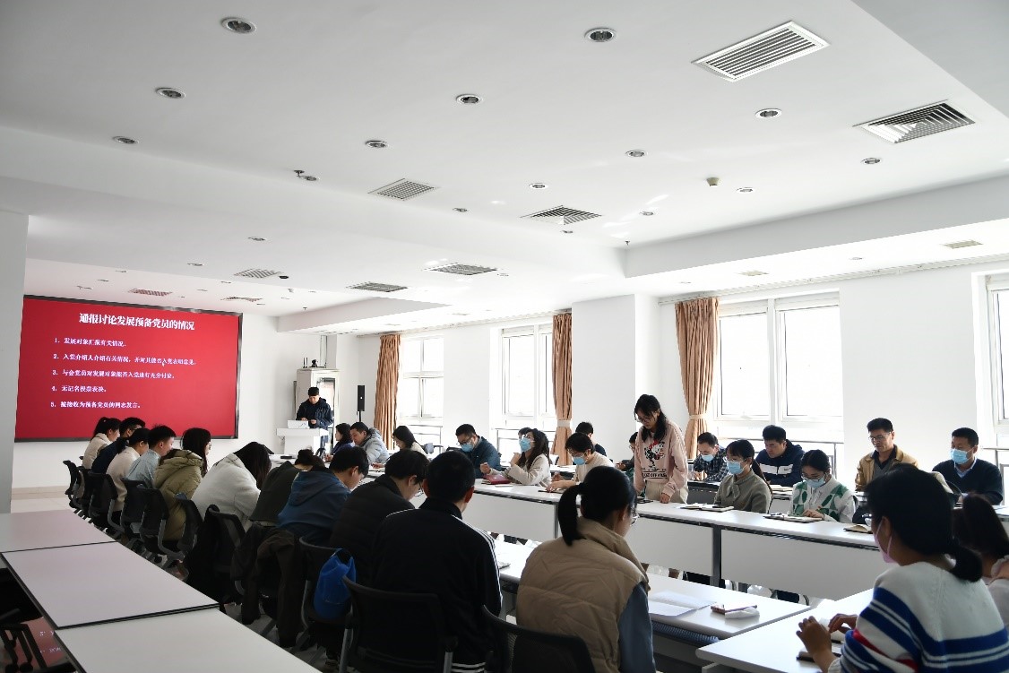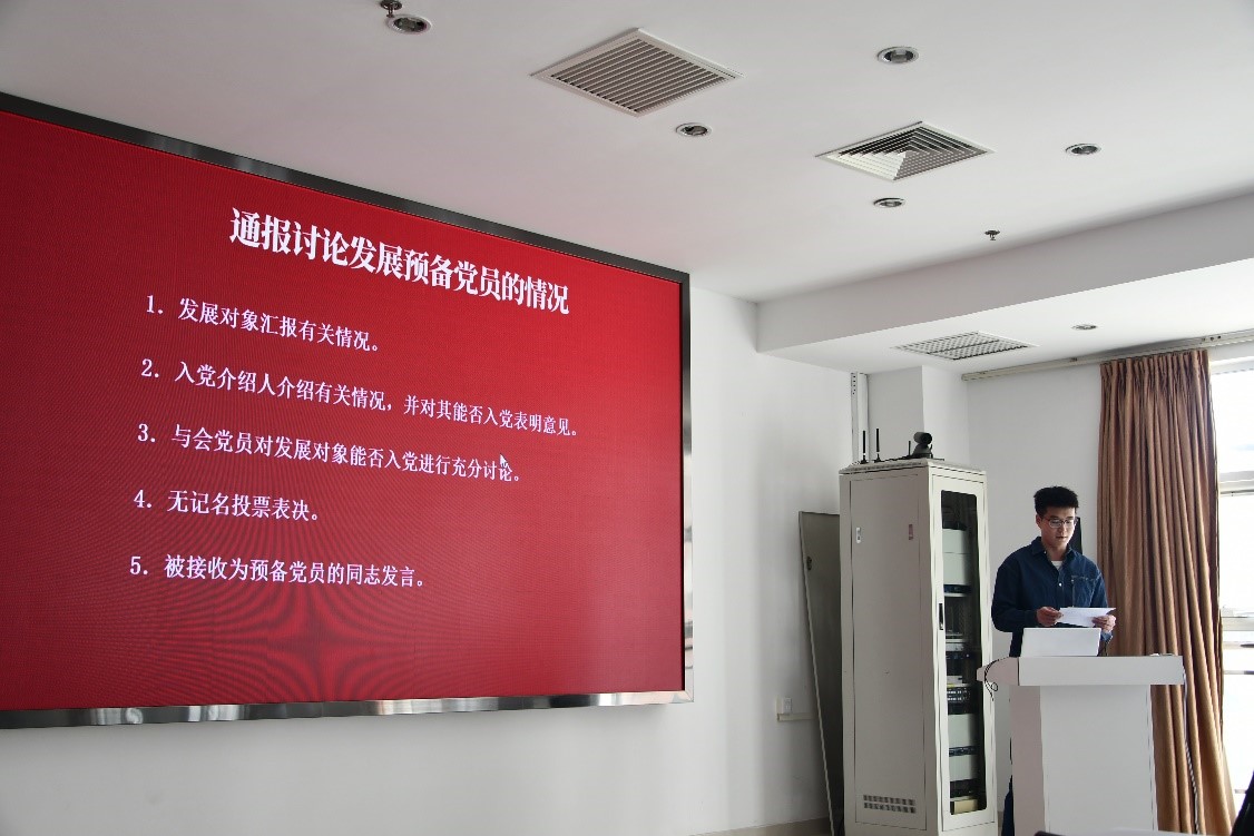 此外,会议通报讨论了接收班新伟、李威威、仇亚红和赵阳4位同志为预备党员的情况。四位同志介绍了本人履历、家庭和主要社会关系、入党动机及对党的认识。入党介绍人介绍了其在积极分子期间的思想动态和实际表现,并对其能否入党表明意见。与会党员对4名同志接收为预备党员进行充分交流讨论,认为他们已经达到党员条件,并建议接收其入党。之后大会进行了无记名投票表决,同意接收为预备党员。