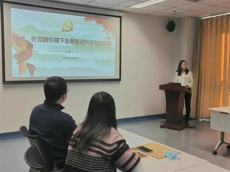 提高思想站位,勇担责任使命。会议第二项议程,所党委委员孟菲同志向支部全体党员作《在党旗引领下全面推进科技自立自强》主题党课讲授。从新民主主义革命时期科技创新思想的萌芽产生起篇,到科技创新落地应用服务社会主义建设和大力推进社会生产力发展,带领大家回顾梳理了中国共产党领导下我国科技创新的百年发展。现今,在承前启后、继往开来的中国特色社会主义新时代,我们依旧坚持创新驱动发展、科技自立自强的战略方向,进一步深刻领会高水平科技自立自强的内涵要义,志从“跟跑并跑”转变为“并跑领跑”,努力做到把科技发展主动权牢牢掌握在自己手里,在伟大复兴中坚定迈向科技强国之路。同时,按照所党委的部署,孟菲同志传达了中国科学院2024年度工作会议精神,对中国科学院院长、党组书记侯建国《加快抢占科技制高点 为实现高水平科技自立自强和建设科技强国再立新功》工作报告进行重点解读,强调全体党员同志要认真学习并深刻领会中国科学院2024年度工作会议精神,敢于迎接挑战,敢于攻坚克难,为抢占国际科技竞争和未来发展制高点作出突出贡献。