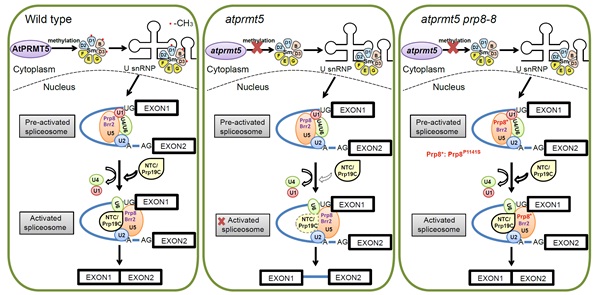 中国科学院遗传与发育生物学研究所曹晓风研究组在前期研究的基础上,利用遗传学、转录组学、蛋白质组学和生物化学等研究手段,阐释了AtPRMT5参与mRNA前体加工的分子机制。曹晓风研究团队利用遗传筛选手段鉴定了两个能够部分回复atprmt5突变体生长发育异常表型以及mRNA前体拼接异常的抑制子,图位克隆显示这两个抑制子编码拼接复合体中U5 snRNP中的核心成员——Prp8 (分别为Prp8P1141S和Prp8P347S点突变)。进一步通过蛋白质组学研究发现,在atprmt5突变体中,拼接激活过程中的重要复合体Prp19 complex以及转酯反应特异的拼接因子与U5 snRNP之间的相互作用明显减弱,而在atprmt5抑制子中得到恢复。拼接复合体中U snRNP的核心组分Sm蛋白对称性双甲基化的缺失也会导致Prp19 complex与其相互作用的减弱,表明AtPRMT5通过影响其底物Sm蛋白与拼接复合体中其它蛋白之间的相互作用从而参与调控了拼接复合体的激活过程。