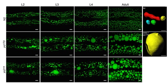 线粒体是细胞内氨基酸降解的重要场所,然而人们对氨基酸代谢异常对线粒体的影响却所知甚少。该团队的研究表明,线粒体中酵母氨酸的正确降解对于线粒体稳态和动物正常发育是必要的。科研人员以秀丽线虫为模式,筛选到两个影响线粒体动态的突变体,yq170和yq211。突变体表皮细胞内的线粒体异常增大(图1)。