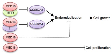 中国科学院遗传与发育生物学研究所李云海研究员研究组在筛选da1-1增强子中发现eod9-1突变体(enhancer of da1-1)。基因克隆发现,EOD9编码中介复合体亚基MED16蛋白。eod9-1与med16-2 (MED16 T-DNA插入突变体)具有大叶、大花和大花序的表型。med16-2叶片与花瓣细胞显著增大大,叶片与花瓣细胞的细胞核内DNA倍性显著增加,表明MED16为核内复制、细胞大小和器官大小的负调控因子。MED16也负调控于细胞分裂。MED16与转录抑制因子DEL1 (DP-E2F-like1/E2Fe)直接互作,DEL1可以介导CCS52A2 (细胞周期后期促进复合体APC/C的激活子)的表达,从而影响细胞核内复制。进一步实验证明MED16依赖DEL1结合于CCS52A2启动子并抑制其表达。遗传分析表明MED16很大程度上依赖于CCS52A1/A2调控核内复制与细胞大小。因此,该研究揭示了核内复制调控细胞及器官大小的新机制。