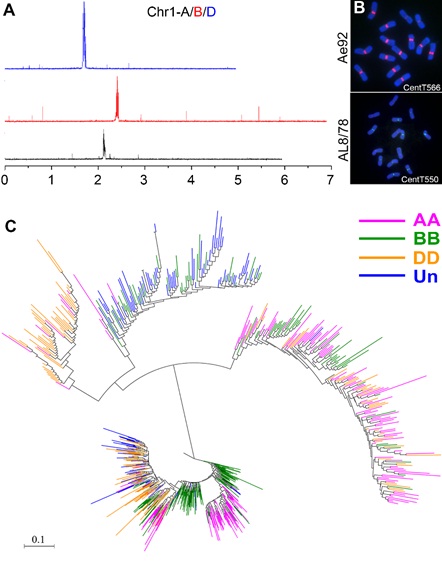 C: 小麦着丝粒satellite序列在不同亚基因组间系统发育分析