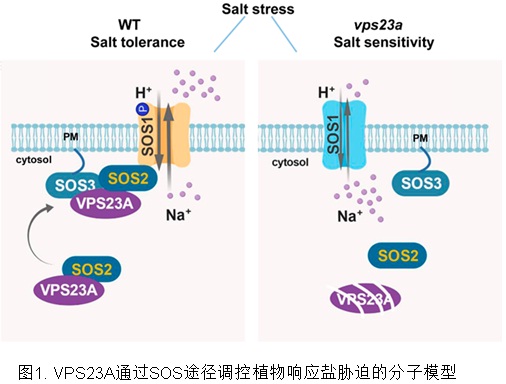 中国科学院遗传与发育生物学研究所谢旗研究组发现拟南芥ESCRTs(Endosome Sorting Complex Required for Transports)的一个关键组分VPS23A参与植物对盐胁迫的响应。盐胁迫下,vps23a突变体中SOS2细胞膜定位减少,导致SOS1的磷酸化水平降低,从而使SOS1活性受到抑制,结果Na+外排能力降低,vps23a突变体表现出对盐胁迫敏感的表型。进一步实验发现VPS23A能够加强SOS2/SOS3复合体的结合并且驱动SOS2定位到细胞膜。遗传学实验验证了SOS2和SOS3在植物体内发挥抗盐功能依赖于VPS23A。基于以上结果--膜定位的SOS2对提高植物的耐盐性至关重要,人为设计了工程化过表达定位于细胞膜上的豆蔻酰化形式的SOS2,结果果然证明这个方案能够显著地提高植物的耐盐性。综上所述,该研究揭示了VPS23A通过SOS途径调控植物耐盐性的分子机制,该研究成果不仅有助于我们进一步理解SOS途径介导的植物耐盐机理,同时对今后培育耐盐作物具有重要的指导意义。