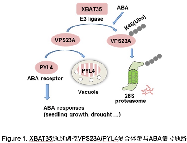 中国科学院遗传与发育生物学研究所谢旗研究组发现VPS23A能够通过26S蛋白酶体途径降解,并且其能够被K48位连接的泛素链修饰。K48位连接的泛素链修饰往往导致被修饰蛋白进入26S蛋白酶体途径进行降解。通过IP/LC-MS-MS的方法,鉴定到一个与VPS23A互作的候选蛋白XBAT35。XBAT35是一个RING类型的E3泛素连接酶,它能够与VPS23A相互作用。xbat35突变体在子叶变绿和根长生长方面表现出对ABA不敏感的表型,并且在干旱处理下,植株存活率下降;这与vps23a突变体的表型相反,暗示着XBAT35作为一个E3泛素连接酶有可能通过泛素化修饰而负调控VPS23A蛋白稳定性。一系列生化实验证明XBAT35的确能够促进VPS23A蛋白的降解,并且XBAT35能够直接介导VPS23A的K48连接的泛素链修饰。因此,VPS23A是XBAT35的一个降解型泛素底物蛋白。进一步实验表明,ABA促进XBAT35对VPS23A的降解作用,从而释放VPS23A对PYL4蛋白的抑制作用,帮助植物激活ABA信号通路以应对外界环境胁迫。该项研究不仅进一步阐明了ESCRT复合体在ABA信号接收中的响应和调控机制,而且揭示了植物中两条主要的蛋白降解途径,包括ESCRT复合体参与的内膜运输降解途径和泛素蛋白酶体降解途径,如何通过影响ABA受体的蛋白水平而精细调节ABA信号的激活和去激活的分子机理。