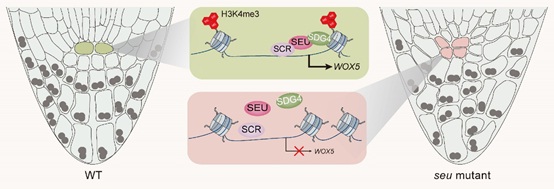 该团队最新的研究表明,动植物中保守的LIM-domain binding (LDB)家族转录调控因子SEUSS (SEU)调控干细胞组织中心的命运决定。他们发现seu突变体中WOX5表达显著下降;且该突变体与wox5突变体呈现类似的干细胞发育缺陷。深入研究表明,SEU作用于SHR/SCR通路正向调控WOX5表达和干细胞组织中心的建立。SEU通过与转录因子SCR直接互作而被招募到WOX5启动子;然后,SEU通过直接互作招募组蛋白甲基转移酶SDG4至WOX5启动子并诱导组蛋白H3第4位赖氨酸的三甲基化(H3K4me3),进而激活WOX5表达。这项研究表明SEU作为支架蛋白整合核心转录因子与表观遗传因子的功能, 形成SCR-SEU-SDG4转录复合体从而精确调控WOX5的时空特异表达和干细胞组织中心的命运决定。