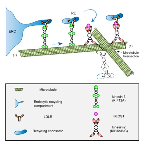 中国科学院遗传与发育生物学研究所税光厚研究组与北京市儿科研究所出生缺陷遗传学研究室李巍教授团队合作,在研究循环内吞体介导的LDL受体运输的分子细胞机制中,发现BLOS1蛋白处于微管交叉点处,将由kinesin-3正向运输的LDLR转换到kinesin-2的运载工具上,进而克服交叉点形成的路障,使得LDLR分子最终被运输到质膜而发挥其功能。在BLOS1特异敲除的肝细胞中,观察到LDLR被逆向运输,继而被溶酶体降解,导致质膜上LDLR缺乏,小鼠血浆中LDL不能及时被肝细胞清除而升高。该发现可能解释了一些高胆固醇血症发生的病理机制。
