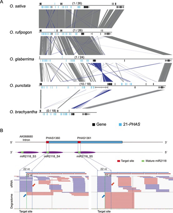 中国科学院遗传与发育生物学研究所陈明生研究组多年从事稻属的比较基因组学研究。近来,通过比较分析五个代表性稻属物种中的phasiRNA位点(PHAS),并结合高通量的小RNA和降解组测序分析,发现了大量新的PHAS位点,其中大部分来自非编码的基因间区。该研究指出局部区域的串联重复是PHAS位点在基因组中扩张的主要方式,并造成其成簇分布;PHAS位点的序列在物种间快速分化,序列不保守,仅在miR2118或miR2275的识别位点受到强的选择,PHAS的分布位置在近缘物种间相对保守。此外,具有5'尿苷(U)的21nt-phasiRNA倾向于在PHAS前体处介导顺式切割,而且这些切割位点在近缘物种中也发生了显著变化。miR2118可以在其自身的天然反义转录本中诱导产生phasiRNA,并且产生的这部分phasiRNA具有反向调节miR2118前体的潜在作用。根据以上结果,研究推测这些生殖相关phasiRNA的起始合成过程相对保守,而phasiRNA产物则在物种间迅速分化,缺乏保守的作用位点,phasiRNA的产生过程受多种反馈调节机制的交互作用。