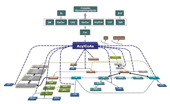 图.关键代谢通路的多维概述,这些代谢通路将甘油脂,甘油脂,磷酸肌醇和鞘脂等主要脂质类别与中间酰基辅酶A用作代谢枢纽。 |