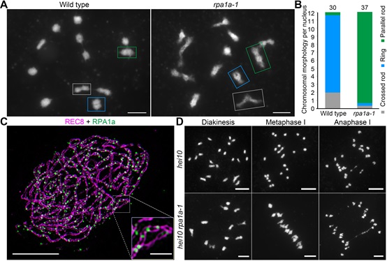 中国科学院遗传与发育生物学研究所程祝宽研究组利用CRISPR/Cas9基因编辑技术,编辑水稻中的单链DNA结合蛋白RPA1a (Replication protein A large subunit),获得了rpa1a突变体植株。研究发现,突变RPA1a蛋白能够使交叉数目显著增多,表明RPA1a能够抑制交叉的形成,首次证实RPA在减数分裂交叉频率调控过程中具有重要功能。进一步研究发现,RPA1a以点状信号定位在染色体上,并与交叉相关蛋白共定位。突变RPA1a能显著增加II类交叉,但并不影响I类交叉的形成。RPA1a与FANCM-BTR蛋白复合体存在互作关系,推测rpa1a突变体中交叉频率的提升,可能通过影响FANCM-BTR复合体的功能实现。本研究证实RPA1a是植物中一个新的交叉调控因子,可以大幅度提升重组频率。