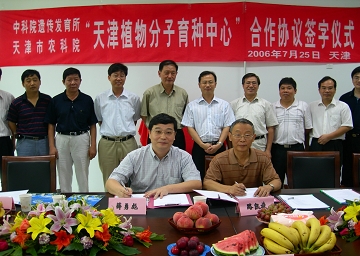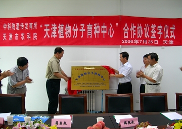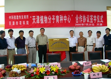 为了进一步加强研究所与地方合作,共建合作平台,推动高新技术尽快转化为生产力,在天津市科委、农委和北京分院的大力支持下,中国科学院遗传与发育生物学研究所与天津市农科院共建的"中国科学院遗传与发育生物学研究所天津植物分子育种中心"于2006年7月25日在天津正式成立,并举行了签约和揭牌仪式。