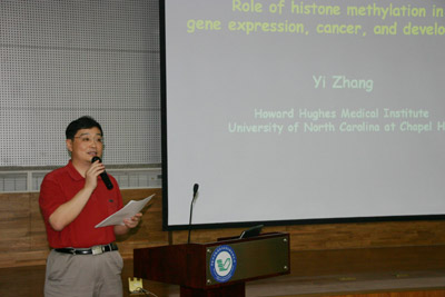 2007年7月27日,北卡罗莱纳大学医学院生物化学和生物物理学教授、霍华休斯医学研究中心的研究员张毅(Yi Zhang)博士访问我所。在薛勇彪所长的陪同下,张毅教授参观了研究所。左建儒研究员、韩敬东研究员、许执恒研究员等与张教授进行了简单会谈。之后,张教授还作了题为"Role of histone methylation in gene expression, cancer, and development"的精彩报告。参加此次接待的还有孙方臻、黄勋、刘佳佳、鲍时来等研究员。