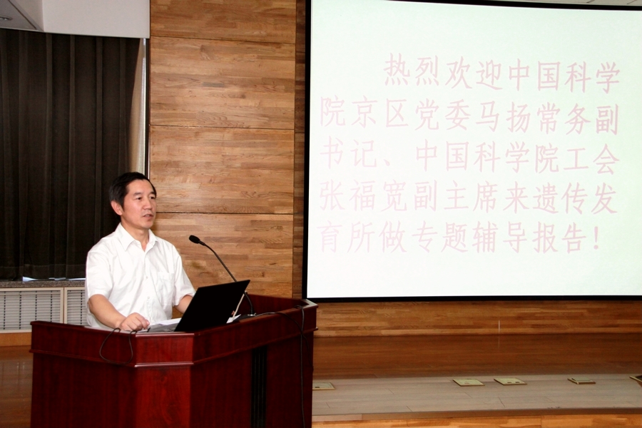 为进一步推进学习型党组织建设和创先争优活动,加强研究所的党建和创新文化建设工作,更好地服务创新2020,遗传发育所党委于2010年7月8日举办了党群干部培训,邀请中科院京区党委常务副书记马扬同志和中科院工会副主席张福宽同志做专题辅导报告。报告会由遗传发育所党委书记宋秋生同志主持,全所40多名党群干部参加了报告会。