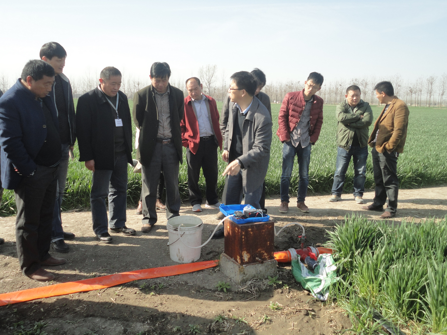 针对淮北平原砂姜黑土农田灌溉存在的问题,课题组进行了广泛调研和田间选型试验,并充分征求相关部门和农户意见,研发出了操作简易、机动灵活、成本低廉、高效省力和宽泛普适的水肥一体化田间灌溉设备。会议现场,课题组人员向与会者介绍了砂姜黑土农田田间灌溉知识和现有的不同类型田间灌溉技术,对本课题组设计的新型水肥一体化田间灌溉设备进行了原理和使用方法介绍。随后,对该设备进行了现场操作和演示。与会者一致认为该灌溉技术省水、省力、省工,成本低、效率高,操作简单、适用范围广,基本能够解决当前农田应急灌溉需求。