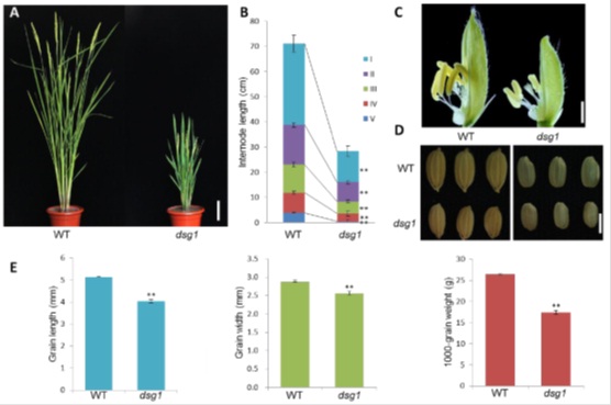 中国科学院遗传与发育生物学研究所陈凡研究组、李云海研究组与中国水稻所合作鉴定了一个水稻矮杆小粒突变体(dwarf and small grain1, dsg1)。图位克隆结果表明DSG1编码一个丝裂原活化蛋白激酶OsMAPK6,与拟南芥中类似,它处于OsMKK4的下游发挥作用。细胞生物学分析表明DSG1是通过调控细胞分裂而调节了细胞数目,进而影响了水稻种子大小及其生物量。进一步的生理学和分子生物学实验分析表明DSG1调控种子大小与油菜素内酯相关。该研究为进一步解析种子大小的遗传调控机制以及改良水稻品质与产量奠定了良好的基础。