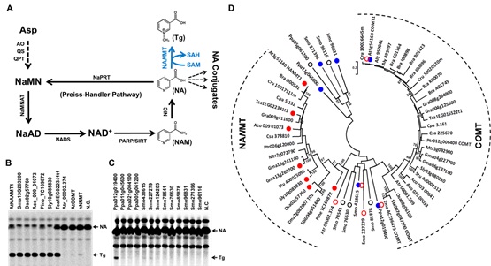 中国科学院遗传与发育生物学研究所王国栋研究组前期的研究表明NA的O-位糖基化修饰可能保护植物细胞免受种子萌发过程中NA过度积累所造成的毒害,而且NAOGT活性是在十字花科植物进化过程中才逐渐获得,NAOGT活性的获得为植物适应环境提供选择优势(Li et al., Plant Cell, 2015)。最近,王国栋研究组发现在拟南芥是一类新型的N-甲基转移酶(NANMT,At3g53140编码)负责尼克酸N-甲基化化合物(又名葫芦巴碱)的生成,同时尼克酸N-甲基化修饰时植物解毒NA的另外一种形式。全面的进化和生化分析结果表明,这类新型的尼克酸N-甲基转移酶的功能来自参与植物木质素生物合成途径的COMT(咖啡酸O-甲基转移酶)基因的复制和功能分化。植物原始的COMT还保留微弱的NANMT活性,表明在植物漫长的进化过程中,NANMT活性的获得促成Preiss-Handler途径在陆生植物基因组得以保留的一个重要原因。