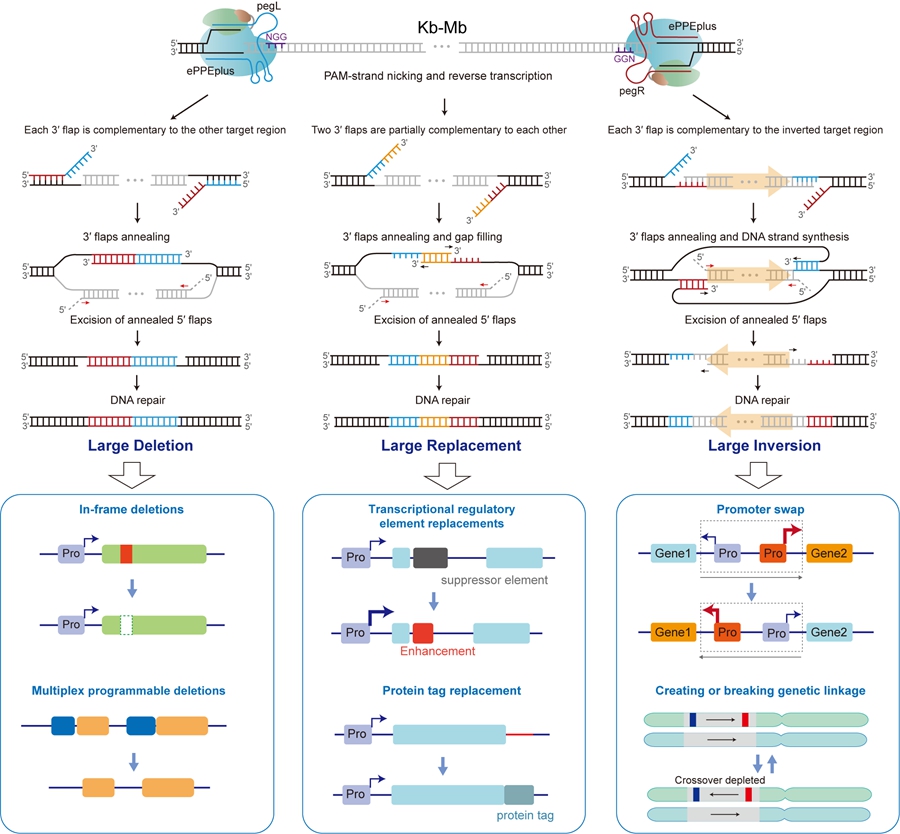基因组结构变异(Structural Variants, SV)是植物遗传多样性的重要来源,也是基因组进化和优异农艺性状形成的重要驱动力。因此,探究如何高效精准地操纵植物基因组结构变异对植物性状改良和农业生物育种具有重要意义。目前,基于CRISPR/Cas的基因组编辑技术,包括Cas核酸酶、碱基编辑(Base editors, BE)和引导编辑(Prime editor, PE)等,已在植物性状改良中得到了广泛的应用。然而,这些技术的编辑尺度大部分情况下仍局限于少数几个核苷酸的替换、删除和插入。尽管CRISPR/Cas9结合双sgRNAs能够在植物中实现基因组大片段DNA的删除和倒位等操纵,但其效率较低,并且由于该策略依赖于DNA双链断裂(Double strand breaks, DSBs)的产生,编辑产物中常常会引入许多非预期的编辑,甚至导致复杂的染色体重排。因此,开发不依赖于DSBs、高效且精准的植物大片段DNA和染色体操纵技术,对植物遗传改良具有重要意义,是植物染色体工程和生物育种技术创新的迫切需求。