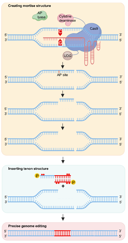 MT系统的设计灵感源于中国古建筑传统木工榫卯结构,核心在于构建 “榫头”(tenon)和“卯眼”(mortise)的精准互补配对。研究团队利用高彩霞团队此前开发的精准DNA删除系统(AFID)中的APOBEC-Cas9-UDG/AP裂解酶复合体,在基因组目标位点产生独特的双链断裂结构,即带有单链或双链5’-突出端的“卯眼”,同时设计带有互补5’-粘性末端的双链DNA供体作为“榫头”,通过末端捕获作用实现供体片段的精准插入或替换。