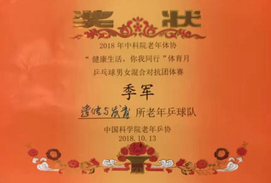 遗传发育所老年乒乓球队在2018院老乒赛中勇夺季军