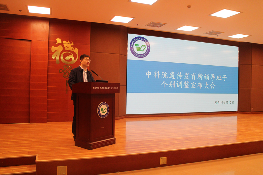 中国科学院遗传与发育生物学研究所领导班子个别调整宣布会议于2021年4月12日召开。中科院人事局副局长蔡宏志、中科院科技创新发展中心领导干部处副处长柳岸、遗传发育所领导班子成员、党委委员、纪委委员、副处以上中层管理人员、副高级以上专业技术人员以及各类职工代表出席了会议。