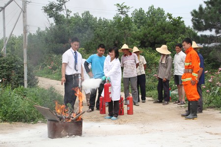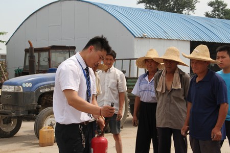 物业公司董振国、杨永士等为农场工人和在现场进行小麦脱粒的课题组人员演示了消防器材和护具的使用方法,讲解了麦田火灾的特点和应急疏散逃生时的注意事项。