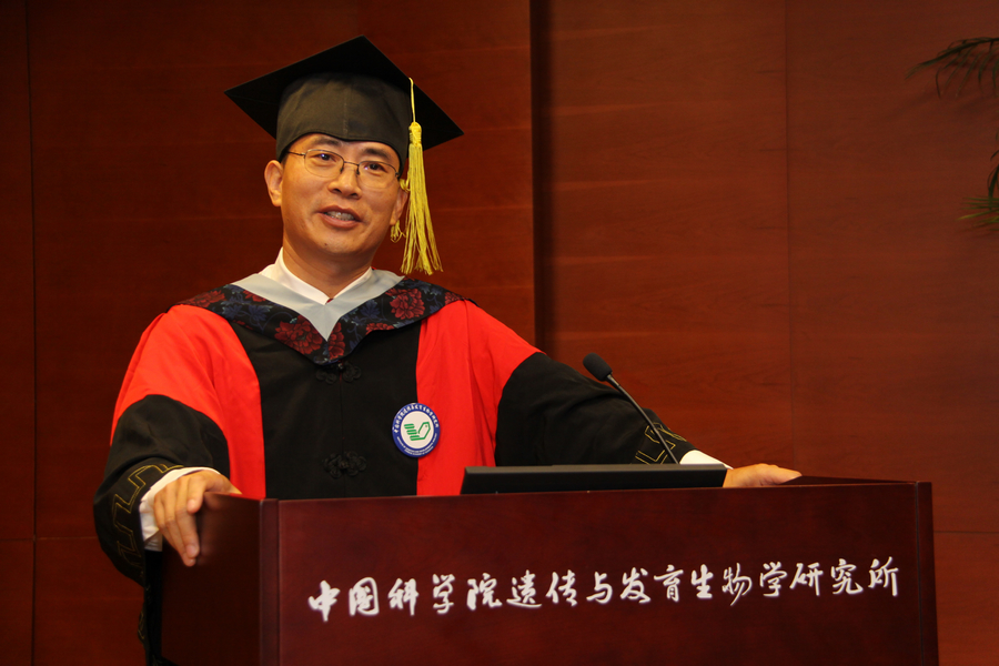 上午九时,毕业典礼在雄壮的国歌声中正式开始。杨维才所长首先致辞,他向所有毕业生致以热烈的祝贺。感谢毕业生在过去的学习生涯中为研究所付出的辛勤劳动与贡献。杨所长说现在虽是毕业季即离别季,但希望毕业生走出遗传发育所后,也要关注遗传发育所的发展,支持遗传发育所的发展;同时,杨所长祝愿毕业生找到理想的工作,并在今后的工作生活中,做到六个字:“自信、自强、我行”,在走上工作岗位之后充分发挥在遗传发育所受到训练的综合素质,始终相信自己是优秀的,在自己的岗位一定能做出好的成绩。杨所长也郑重地嘱托毕业生利用毕业后这段时间回家看看,孝顺父母。最后杨所长也希望毕业生能给研究所研究生培养提出好的建议,并祝愿毕业生事业顺利,天天快乐。随后,家长代表刘彤先生对圆满完成学业的毕业生表达了祝贺,也对辛勤培养学生的导师表示了谢意,同时祝愿2015届毕业生一生平安,事业有成。接着,导师代表陈化榜研究员发表了热情洋溢的讲话,他祝贺了各位毕业生获得学位,也感谢了毕业生在学期间为研究所作出的贡献,同时与毕业生分享了自己的经验:要想做成事,必先做好人;工作上树立信心,有所为,有所不为;同时要拥有健康的身体。毕业生代表陈同博士回忆了自己在研究生阶段心路历程,总结了经验与教训。感谢研究所的培养并对研究所和毕业生送上了美好祝福。