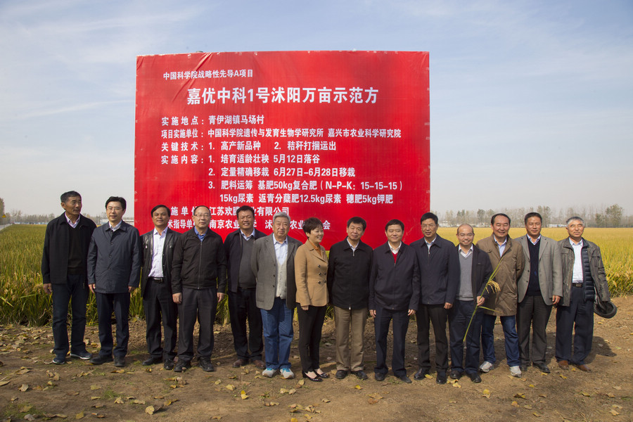10月31日,中国科学院“分子模块设计育种创新体系”先导专项创制的“嘉优中科1号”模块新品种,在江苏沭阳举行了万亩示范方的现场考察和测产验收。中国科学院重大科技任务局副局长黄铁青、资环生物处副处长姚远,科学传播局新闻联络处业务主管刘宇飞、王洋,分子模块先导专项监理组专家王贵海、相建海、夏桂先研究员,专项总体组专家种康、程祝宽、何祖华、王台、田志喜、林少扬研究员,专项子课题负责人李家洋院士及其团队成员刘贵富副研究员,专项依托单位遗传与发育生物学研究所所长杨维才、书记胥伟华,科技发展部部长陈凡、重大办主任邓向东,综合事务管理部副部长张颖娇,专项总体办常务副主任李明、副主任顾佩芝,江苏省农委副主任张坚勇、种子管理站站长何金龙,宿迁市政府副市长光华、市农科院院长刘永锋,沭阳县委书记卞建军、代县长彭伟,以及浙江省种子管理站、嘉兴市农科院及部分区县种子管理站相关负责人,江苏欢腾农业、合肥丰乐种业等种业公司代表等,共计70余人参加本次考察调研活动。人民日报、新华社、中央电视台、光明日报、经济日报、中央广播电台、科技日报、农民日报、文汇报、湖南卫视、中国科学报、中科院声像中心等10多家新闻媒体记者随行进行了现场采访。