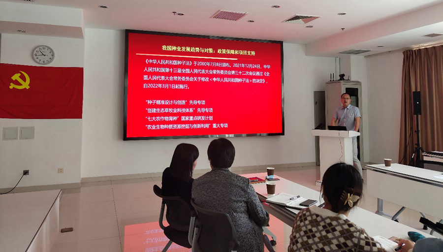 会议第二项,支部书记任勃结合习近平总书记今年4月10日考察崖州湾种子实验室的新闻,讲了一堂以“攥紧中国种子,端牢中国饭碗”为主题的党课。从种业发展的五个阶段、种业历程上的功勋人物及种业现代化发展阶段存在的问题等方面讲述新中国成立以来种业的发展历程。同时,任勃结合国家政策、我国种业发展现状以及研究所科研动态指出,我们作为“国家队”、“国家人”,要心系“国家事”,肩扛“国家责”;要胸怀祖国,服务人民;要有十年磨一剑,培育好种子的决心;希望通过我们的努力,加强良种技术攻关,育得中国种子来保障中国粮食安全!
