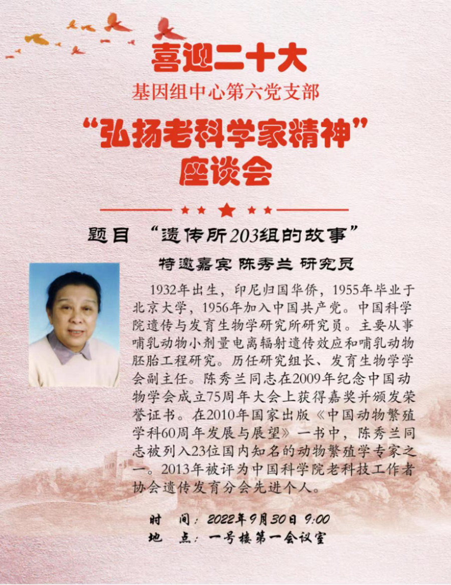 “庆祖国华诞日,承科技报国志”——基因组生物学研究中心第六党支部举行党员大会暨“弘扬老科学家精神”座谈会