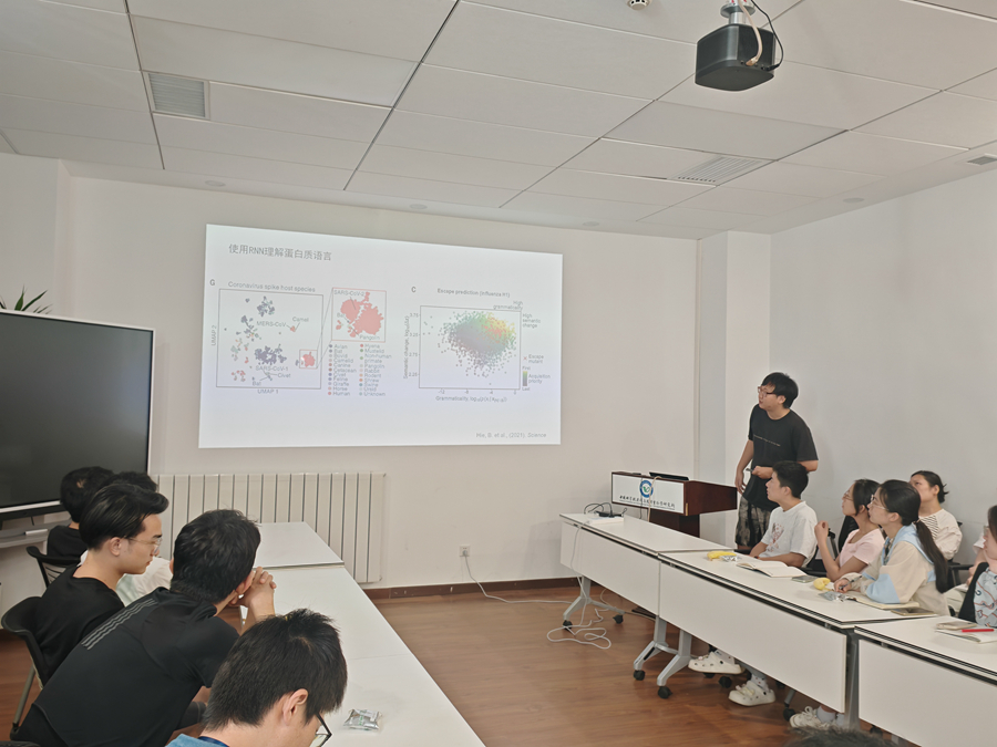 本期沙龙由钱文峰研究组博士研究生王炜光担任主讲。他以“Life essence, decoded by AI”为题,系统地向大家介绍了人工智能算法如何辅助人类认识蛋白质序列和结构上的规律,进而帮助人类优化现有蛋白质和设计新型蛋白质的过程。王炜光从人脑处理外界信息的方式入手,详细介绍了研究人员如何模仿人脑处理语言和图像信息过程来构建不同的人工智能模型,并讲解了基于这些人工智能模型预测蛋白质序列及结构的原理与方法。他指出,研究人员将经过亿万年自然选择的蛋白质序列当成自然语言进行处理,利用人工智能模型学习蛋白质序列中的语法规律,并将蛋白质结构类比成图像进行处理,归纳蛋白质结构中分子之间的相互作用规律,在此基础上进行不同维度的蛋白质结构与功能预测。同样,利用人工智能模型对蛋白质结构与功能的关系进行学习,可以优化现有蛋白质的功能,或根据关键结构域预测生成具有目标功能的新蛋白质。王炜光同时指出,不同的蛋白质有着不同的结构复杂性,设计和优化的难度各异,人工智能模型在这一领域虽展现出巨大潜力,但迄今为止鲜有提高蛋白质已有功能的成功案例,这凸显了人工智能在蛋白结构预测与优化设计领域仍面临诸多亟待克服的技术挑战与难题。