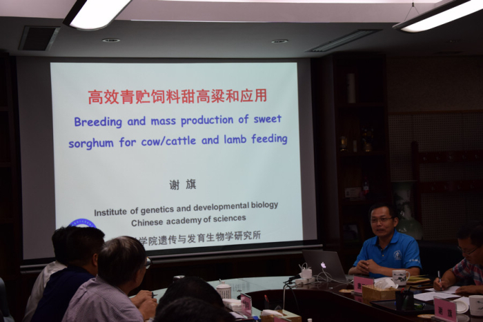 遗传发育所谢旗研究员对甜高粱研发的最新成果进行了介绍。着重介绍了农业部最新登记甜高粱品种在宁夏、新疆、盐城以及东营等盐碱地的种植培育情况,以及已见成效的成果。同时谢旗还代表其它研究室汇报了研究所耐盐大豆、杨树的筛选和鉴定工作。
