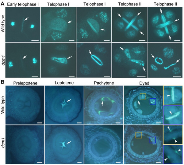 有丝分裂过程中,植物的胞质分裂与其它生物由外而内的胞质分裂方式不同,它的细胞板由内而外延伸,最终将细胞质分离。然而对于植物花粉母细胞减数分裂过程中,胞质分裂调控的分子机制还很少了解。 中国科学院遗传与发育生物学研究所程祝宽研究组在水稻中鉴定出一个调控花粉母细胞胞质分裂的蛋白DCM1(Defective Callose in Meiosis 1)。dcm1突变体花粉母细胞由于无法进行胞质分裂,使得减数第二次分裂的纺锤体取向异常,最终产生大小不一的花粉,最终表现为雄性不育。该突变体的花粉母细胞在胞质分裂时,胼胝质板提前降解,导致胞质分裂无法完成。DCM1蛋白的C端含有五个串联的CCCH锌指结构域,并与核 多聚腺苷酸结合蛋白OsPABNs存在相互作用,推测DCM1可能参与核内mRNA代谢。相关研究为深入了解植物花粉母细胞胞质分裂的分子机制奠定了重要基础。 该研究结果于2018年11月12日在线发表于PLoS Genetics杂志(DOI:10.1371/journal.pgen.1007769)。在读博士研究生张超为该文章的第一作者,程祝宽研究员和李亚非助理研究员为共同通讯作者。该研究得到国家重点研发计划、国家自然科学基金等项目的资助。 图:dcm1花粉母细胞中胼胝质板(A)及外周胼胝质(B)发生提前降解。 原文链接:The Zinc Finger Protein DCM1 is Required for Male Meiotic Cytokinesis by Preserving Callose in Rice