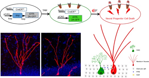 中国科学院遗传与发育生物学研究所郭伟翔研究组,通过细胞清除,反转录病毒介导的单细胞标记以及信号通路调节等实验手段,发现神经干细胞可以持续提供Pleiotrophin (PTN) 配体促进其子代新生神经元发育。若没有此前馈作用,新生神经元树突会发育异常。进一步研究发现,PTN主要通过作用新生神经元上的ALK受体,从而激活AKT信号通路来促进海马新生神经元的发育。