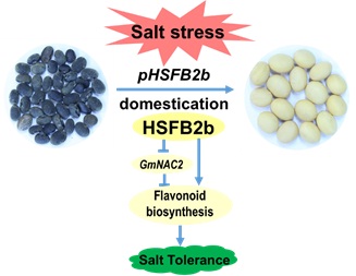 中国科学院遗传与发育生物学研究所张劲松研究组、陈受宜研究组与黑龙江农科院来永才研究组合作从103份野生大豆资源中筛选得到2份耐盐性强的野生大豆资源,通过RNA-Seq差异表达基因和共表达网络分析得到参与大豆盐胁迫反应的B类转录因子基因HSFB2b。在大豆转基因毛状根体系和稳定的转基因大豆中过表达HSFB2b均可以提高大豆的耐盐性。进一步研究发现HSFB2b可以直接激活黄酮类化合物合成途径,同时解除另一个转录因子GmNAC2的抑制作用,从而促进黄酮类化合物的合成,降低体内ROS的积累以提高大豆的耐盐性。