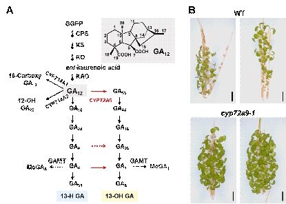 最近,王国栋研究组在十字花科和豆科植物中功能鉴定了负责赤霉素13-羟化反应的P450酶(属于CYP72A亚家族)。新鉴定的CYP72A酶,不同于水稻中的CYP714B,可以催化多种赤霉素(GA12, GA9 和GA4)的13-羟基化,生成对应的13-OH 赤霉素 (GA53, GA20 和GA1)。进一步的研究发现,拟南芥中的CYP72A9在种子中特异性高表达,cyp72a9突变体种子中内源GA1 几乎检测不到,对应的GA4含量升高1-2倍。生理实验结果表明,CYP72A9通过调控低生理活性的GA1和高生理活性的GA4的比例,实现对种子初级休眠生理过程的调控:cyp72a9突变体种子比野生型表现出萌发更快,而且该生理功能再十字花科植物中保守。通过对各种转基因材料的内源赤霉素分析表明,水稻和拟南芥形成GA1的代谢途径不同:水稻中GA53通过多步氧化反应生成GA1,而在拟南芥中GA4在CYP72A9的作用下直接生成GA1。该项工作不仅是植物赤霉素代谢领域一个新的突破 ,而且也为基因工程改造(结合基因编辑技术)植物赤霉素代谢,进而调控植物(作物)的生长发育过程,提供了新的靶点。