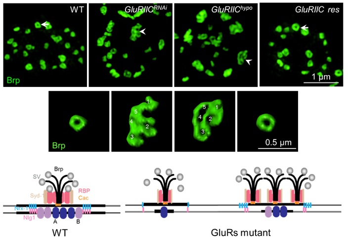 上图:GluRIICRNAi和GluRIIChypo突变体突触前Brp聚集形成Brp多环结构;