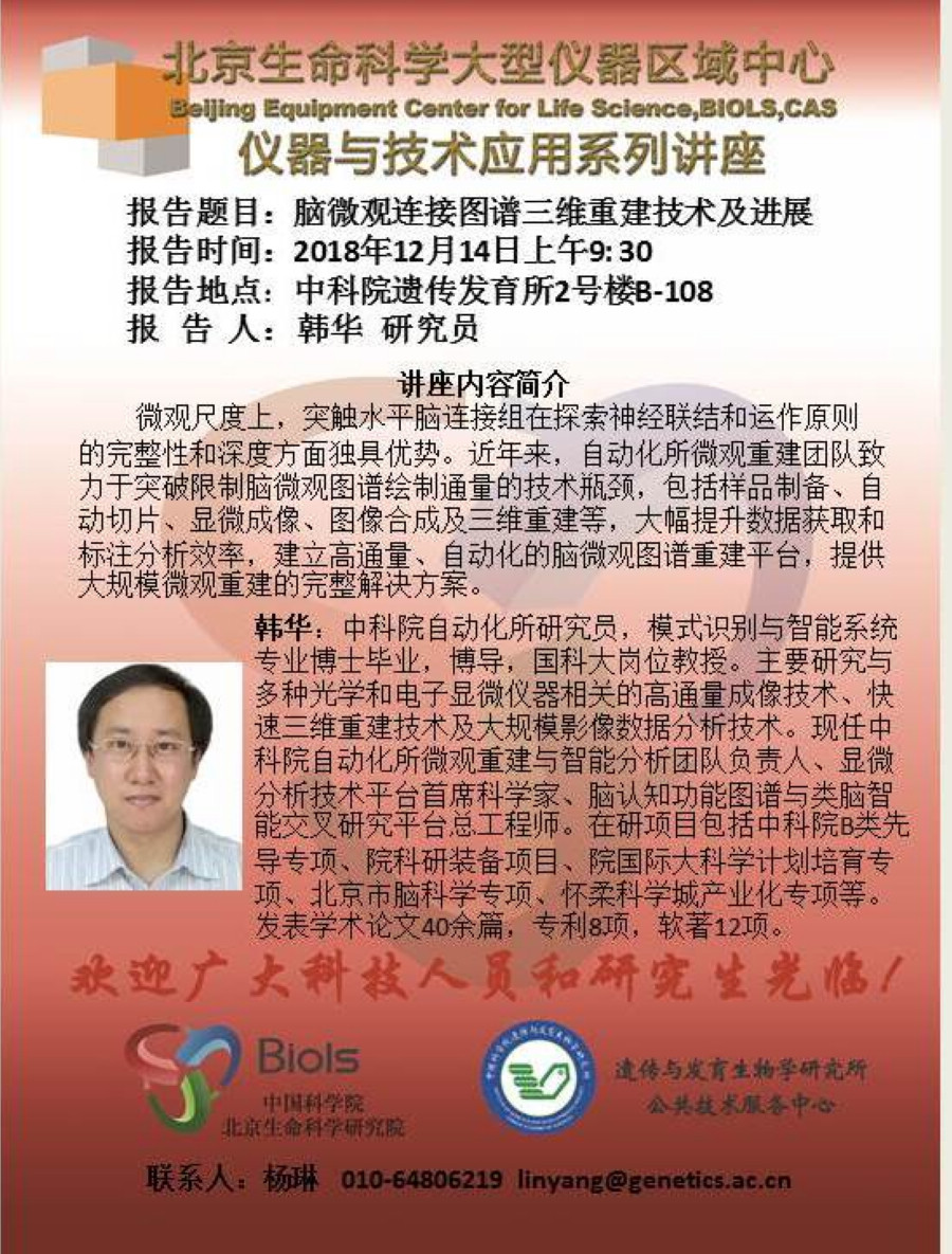 仪器与技术应用系列讲座:脑微观连接图谱三维重建技术及进展(时间:2018年12月14日9:30)