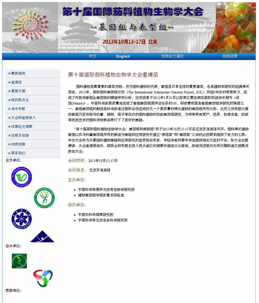第十届国际茄科植物生物学大会(The 10th Solanaceae Conference,SOL2013.时间:2013年10月13-17日)