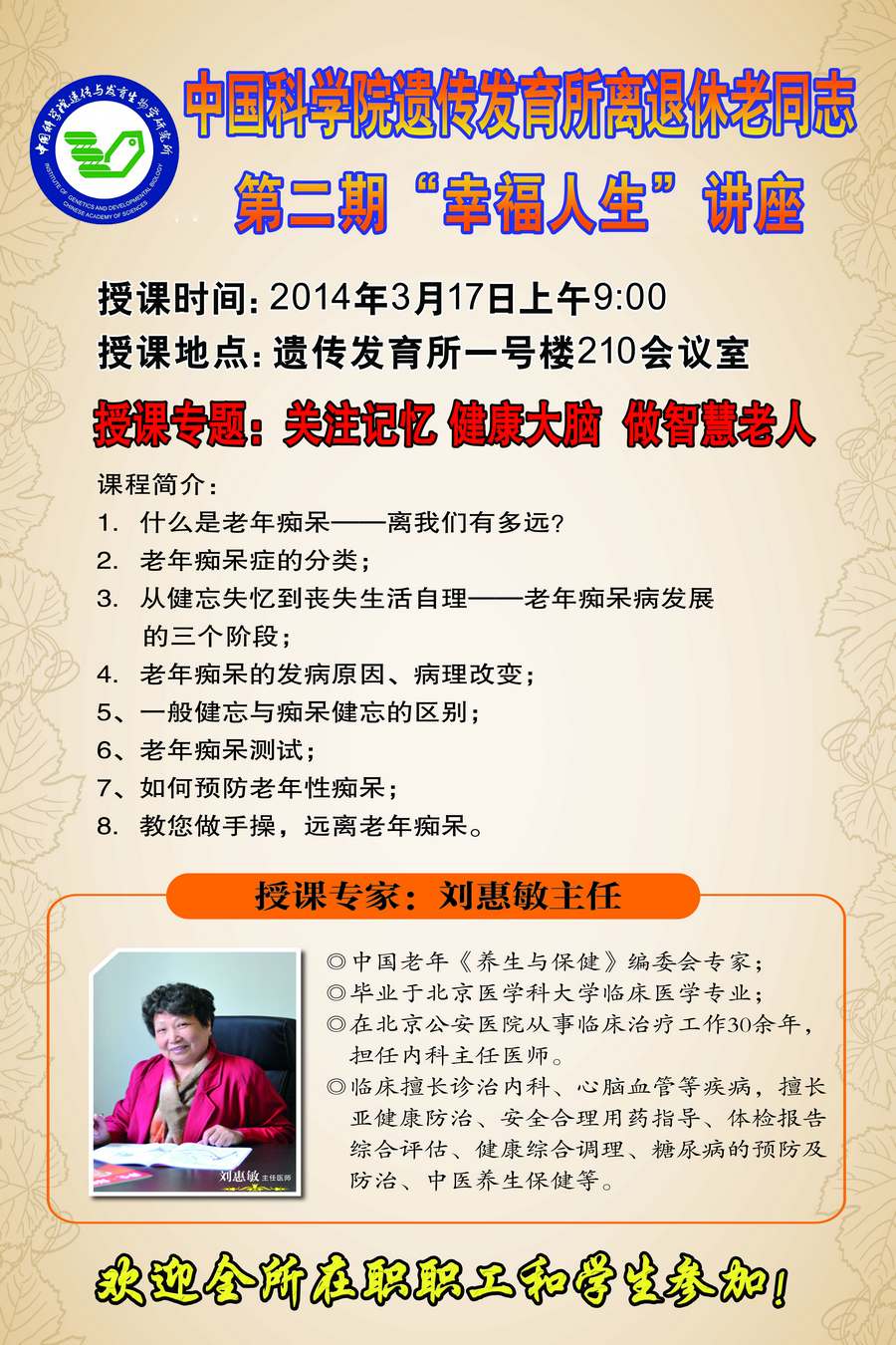 中科院遗传发育所离退休老同志第二期“幸福人生”讲座:关注记忆,健康大脑,做智慧老人(时间:2014年3月17日上午9:00)
