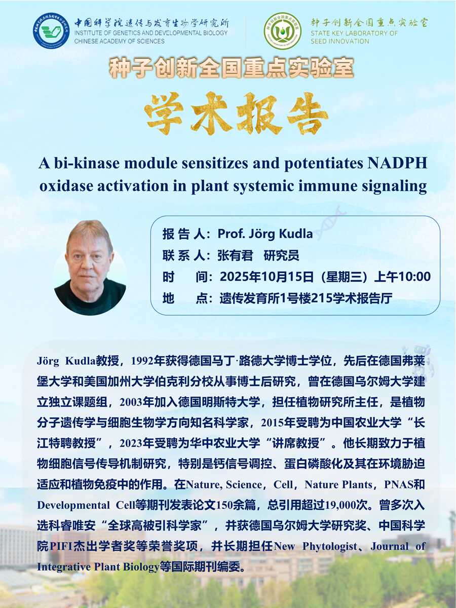 种子创新全国重点实验室学术报告:A bi-kinase module sensitizes and potentiates NADPH oxidase activation in plant systemic immune signaling (2025年10月15日,上午10:00)