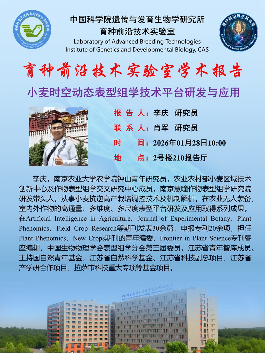 育种前沿技术实验室学术报告:小麦时空动态表型组学技术平台研发与应用(时间:1月28日10:00)