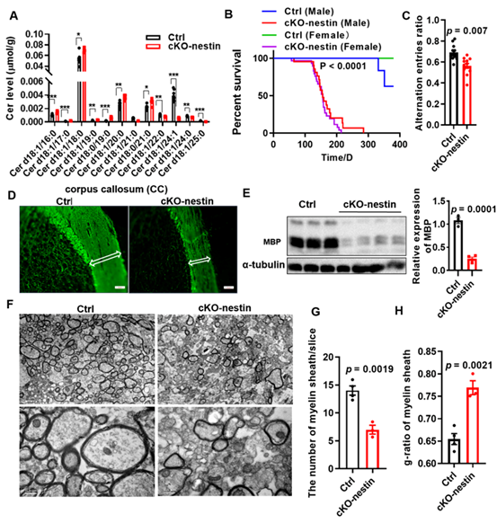 研究人员首先构建了中枢神经系统特异性(cKO-nestin)和少突胶质细胞特异性(cKO-OL)的神经酰胺合酶2(CerS2)条件性敲除小鼠。CerS2是合成C22–C24