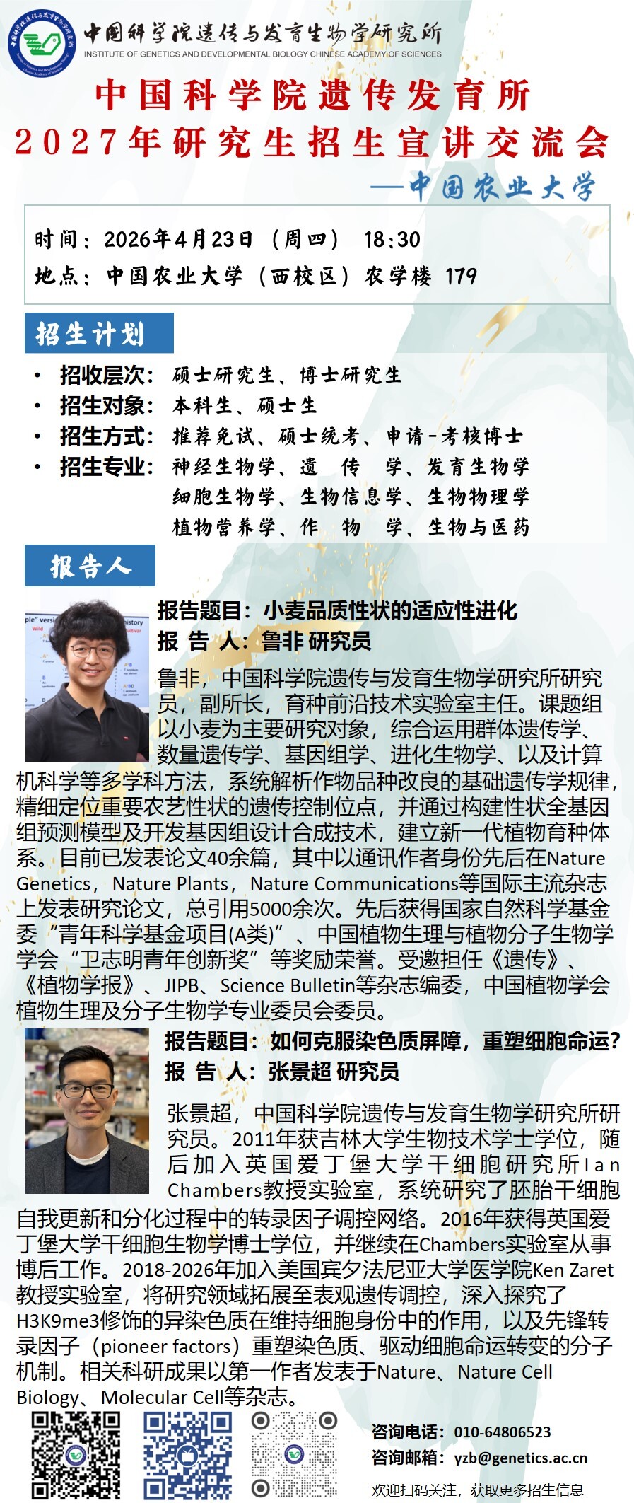 欢迎参加遗传发育所2027年招生宣讲交流会·中国农业大学